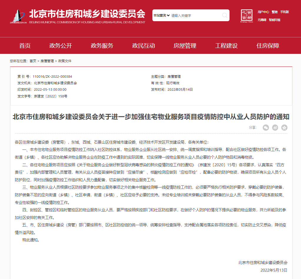 在5月10日住房和城乡建设部办公厅、邮政局办公室两部门发文明确将物业纳入防疫体系后,北京市率先做出表率。