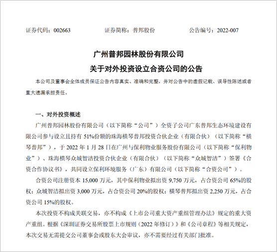 近日,保利环境(公司全称“保利环境服务(广东)有限公司”)注册成立,注册资本1.5亿元,目标直指打造国内提供环卫行业综合解决方案的头部企业。股东涉及保利物业[06049]和普邦股份[002663]两家上市公司,控股股东为保利物业。2月7日,普邦股份发布公告,公司全资子公司广东普邦生态环境建设有限公司参与设立且持有51%份额的珠海横琴普邦投资合伙企业(有限合伙)(简称“横琴普邦”),与保利物业服务股份有限公司(简称“保利物业”)、珠海横琴众城智洁投资合伙企业(有限合伙)(简称“众城智洁”)签署《合资合作协议书》,共同设立保利环境服务(广东)有限公司(简称“保利环境服务”)。公告内容显示:本次设立合资公司是以环卫服务为基础,布局两翼“垃圾分类+再生资源回收利用”及“园林绿化养护+市政基础设施维护”,同时以数字驱动、科技赋能为理念,通过打造智慧环卫产业应用体系和环卫科技创新方案,引领环卫行业旗帜,助力公司内生发展与外延扩张相结合,完善产业链布局;投资各方各自发挥其优势,在服务方案设计、市场拓展、项目运营等方面为合资公司提供全面支持,共同将合资公司打造成国内提供环卫行业综合解决方案的头部企业。天眼查显示,保利环境服务(广东)有限公司于2022年1月29日注册成立,注册资本15000万人民币,经营范围涉及“专业保洁、清洗、消毒服务;农村生活垃圾经营性服务;园区管理服务;市政设施管理;城市绿化管理;再生资源回收”等。其中,保利物业拟出资9750万元,占合资公司65%的股权;众城智洁拟出资3000万元,占合资公司20%的股权;横琴普邦拟出资2250万元,占合资公司15%的股权。