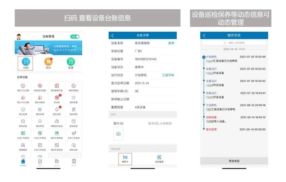 全方位的静态档案信息,设备信息展示更全面,各项信息一目了然。告别繁杂的资料整理和调阅,电子化台账信息随时随地只需扫码便可轻松查阅各项信息。