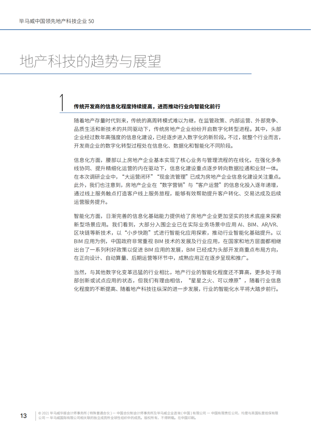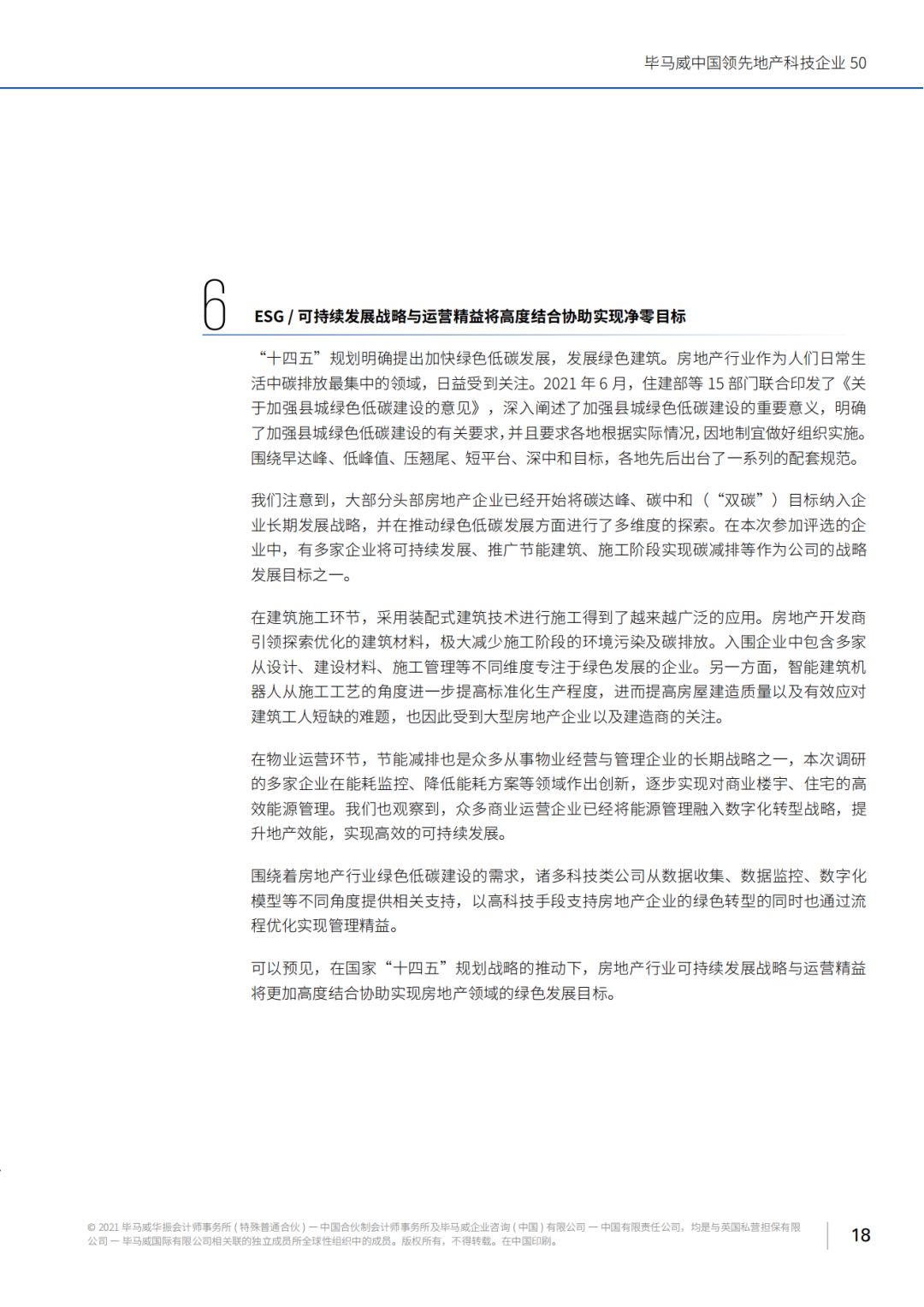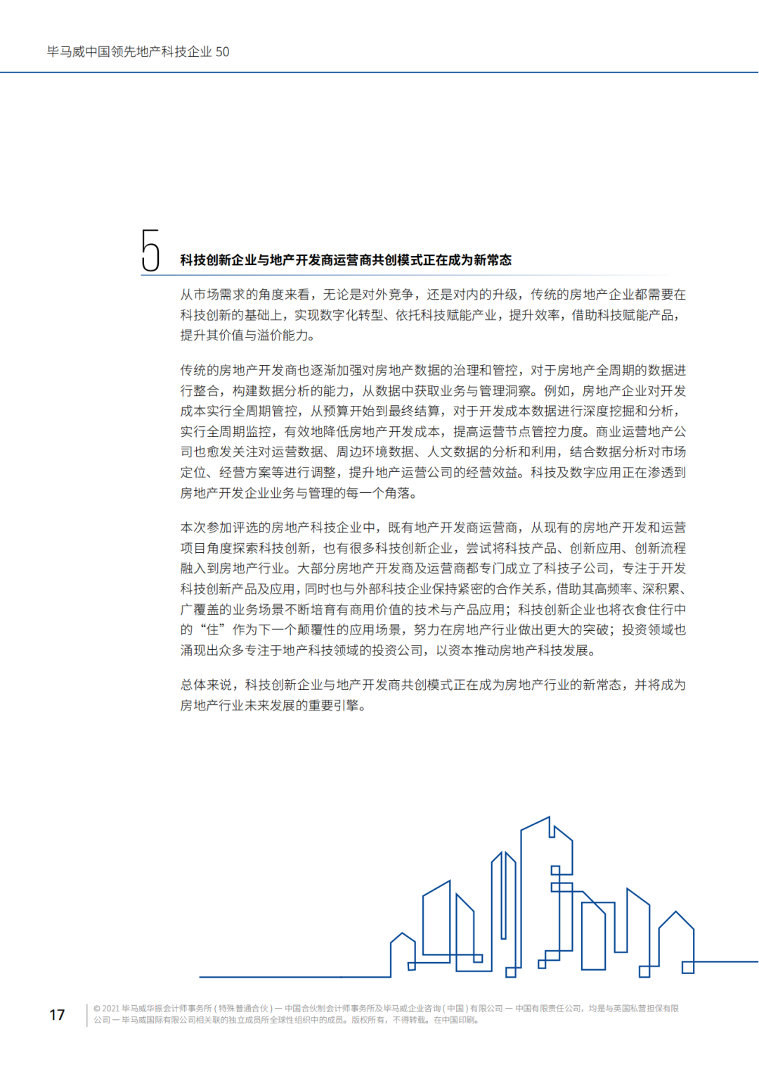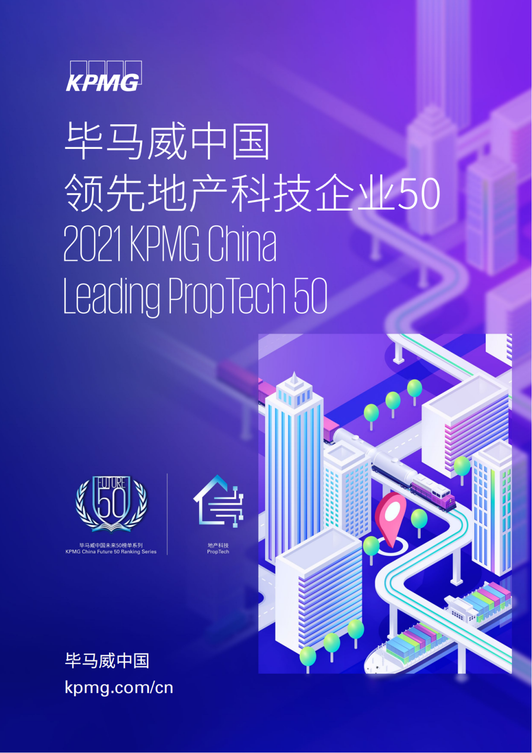 毕马威中国在 2021 年度推出中国领先地产科技企业 50 榜单,旨在加强市场对地产领域科技创新的关注,推动行业交流,促进地产科技的蓬勃发展。