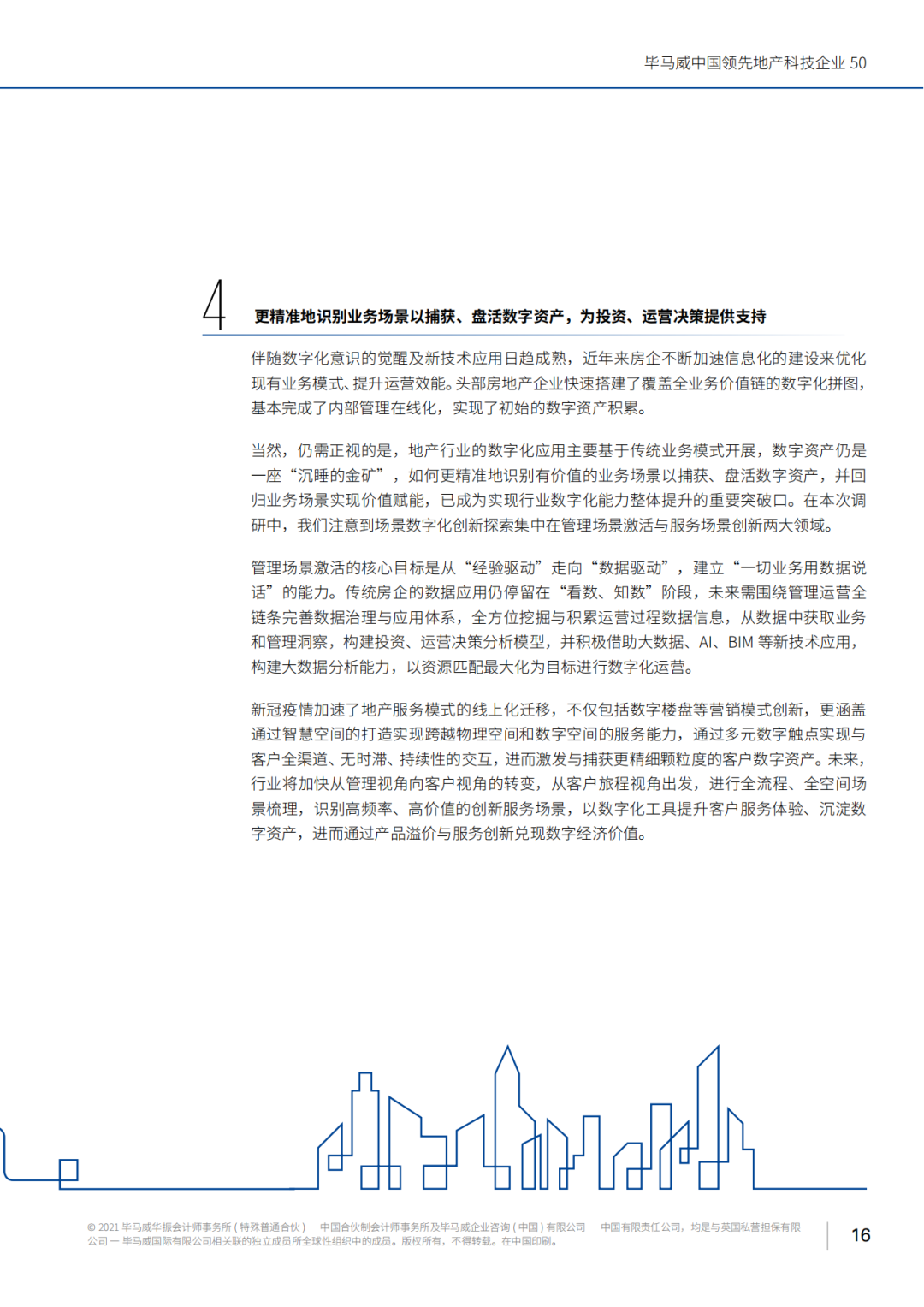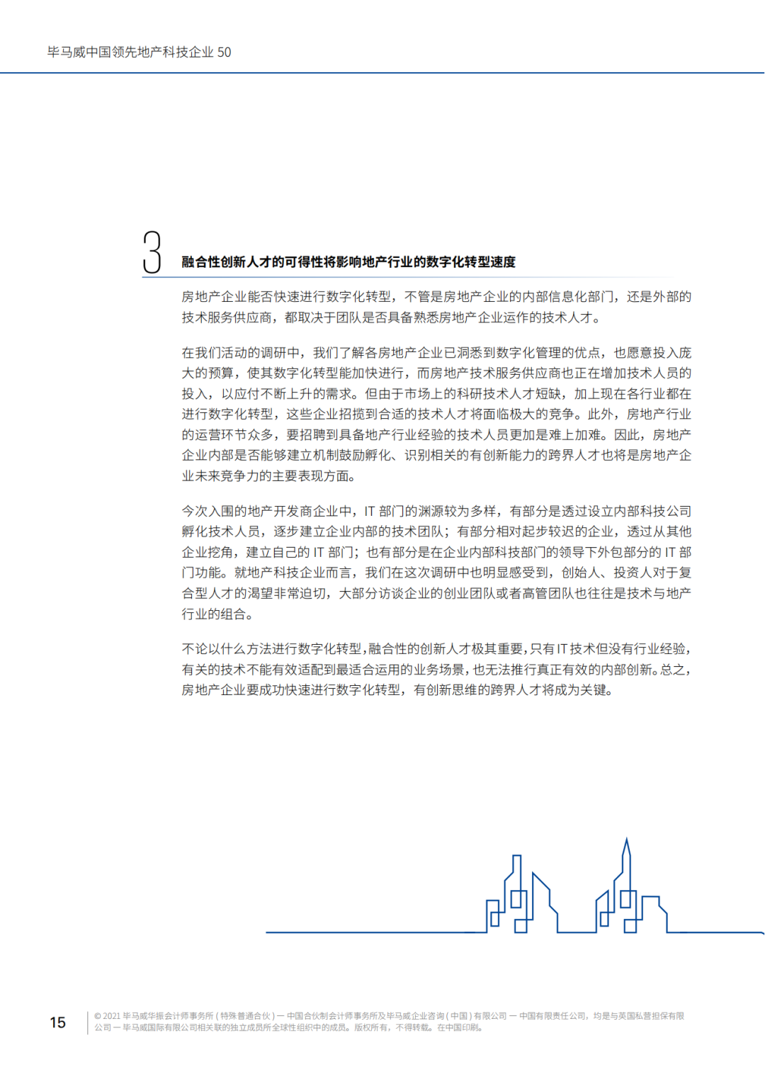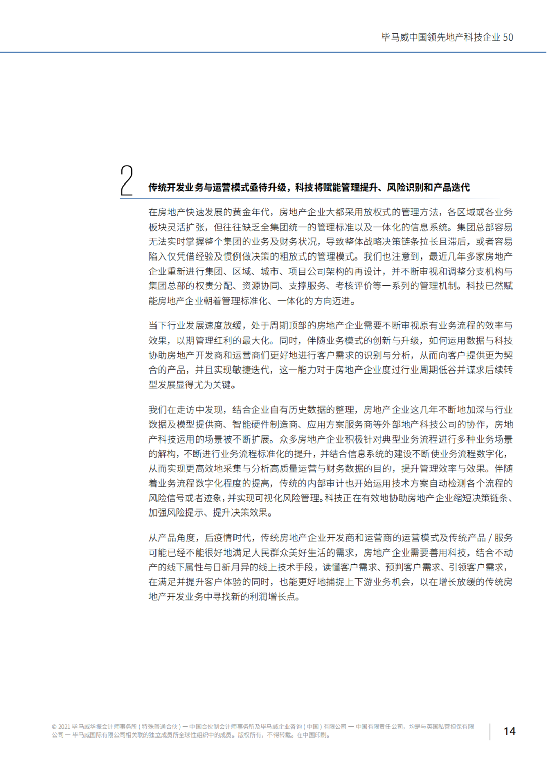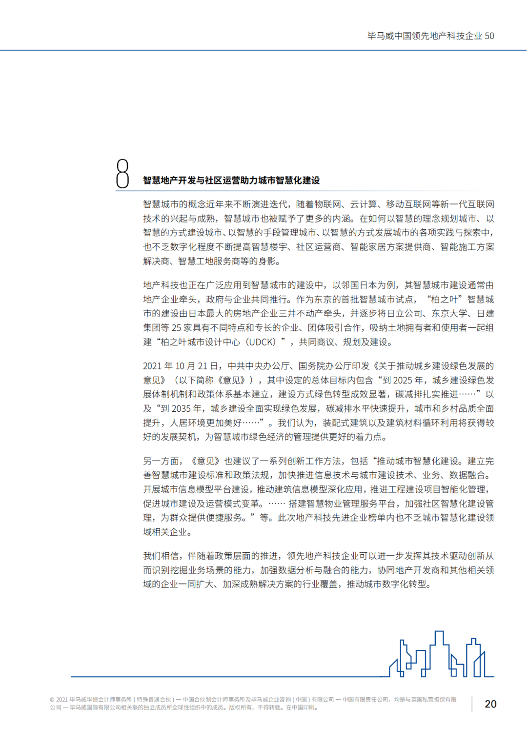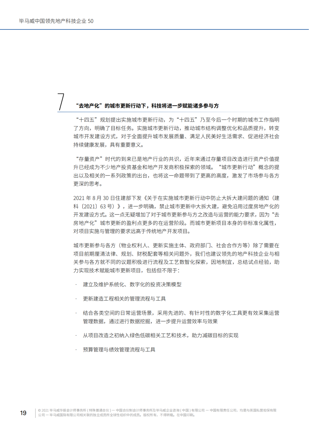 毕马威中国在 2021 年度推出中国领先地产科技企业 50 榜单,旨在加强市场对地产领域科技创新的关注,推动行业交流,促进地产科技的蓬勃发展。