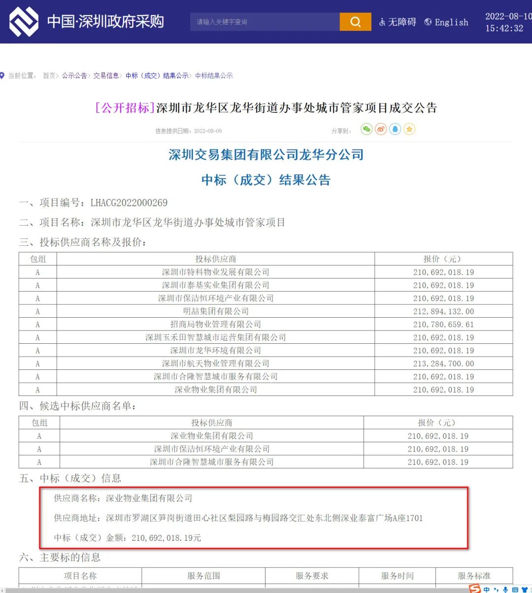 据悉,2020年9月,深业集团(深圳)物业管理有限公司中标龙岗区吉华街道城市管家服务项目,中标金额588