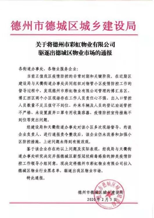 当前正值我区疫情防控的非常时期和关键阶段。在近期区建设局与天衢街道办事处共同组织对物管小区疫情防控工作的督导过程中,发现德州市彩虹物业有限公司管理的博汇东区、博汇西区两个小区现场存在工作人员责任心不强、出入口管控人员数量不足且值守不到位,外来车辆及人员的登记劝返管控不严格、未设置废弃口罩专用收集容器、疫情防控宣传措施不到位等突出问题。 经建设局和天衢街道办事处对该小区多次现场督导、约谈企业负责人、进行通报责令整改后,该企业仍未改善和加强小区防控措施,上述问题未得到有效改观。 鉴于该企业存在的以上问题及实际表现,经我局与天衢街道办事处研究决定并报德城区新型冠状病毒感染的肺炎疫情防控工作领导小组同意,现决定将德州市彩虹物业有限公司拉入德城区物业行业黑名单,驱逐出我区物业市场。 特此通报。
