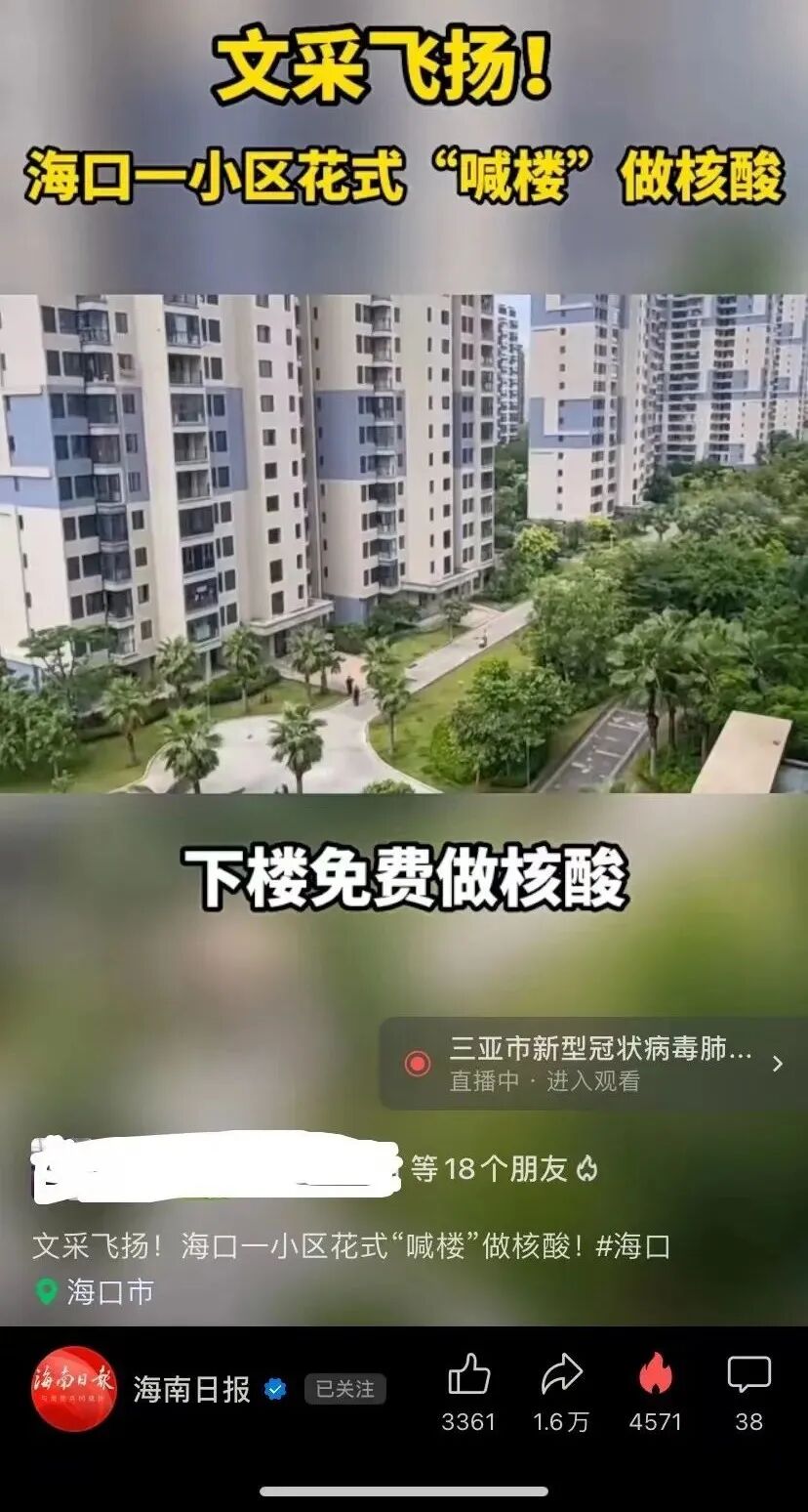 8月11日,海口智诚物业管理服务的蓝城印象小区,传来了安保人员的“喊楼”声——“做核酸,保平安,下楼免费做核酸……天下英雄出我辈,只有绿码最珍贵。世界那么大,想出去看看,绿码不在手,哪都别想走……”被逗乐的业主拍下视频,网上热传。花式“喊楼”引起海南日报官方视频号关注报道,短短,“文采飞扬!海口一小区花式喊楼”视频全网转发过万,点赞近万。疫情拉远了人与人的空间距离,同心抗疫拉近了人与人的心理距离。智诚人相信,众志成城,这场战疫一定能赢!
