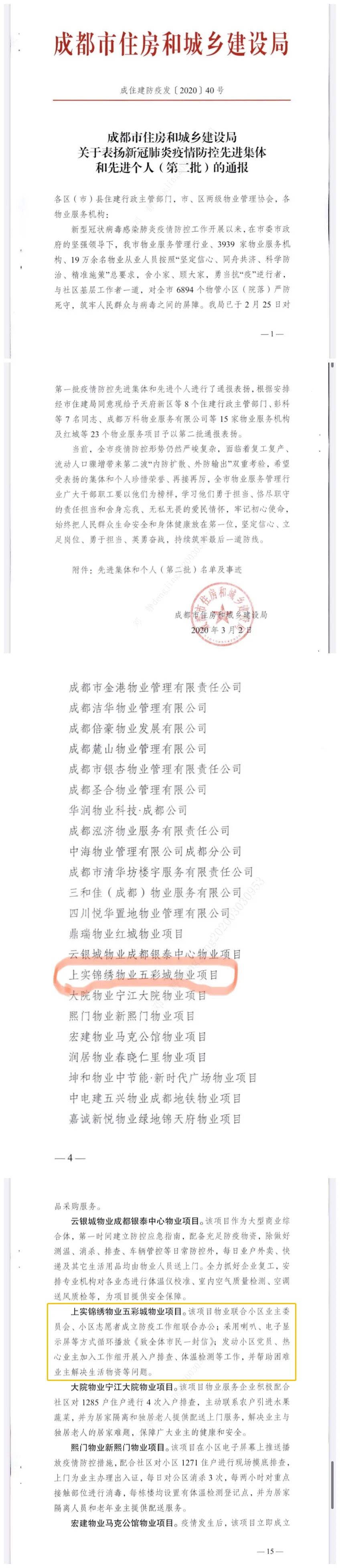 上实锦绣物业五彩城物业项目获评成都市住房和城乡建设局新冠肺炎疫情防控先进集体称号