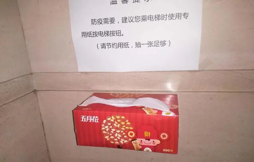 ▶ 电梯旁准备餐巾纸以供干警按电梯使用