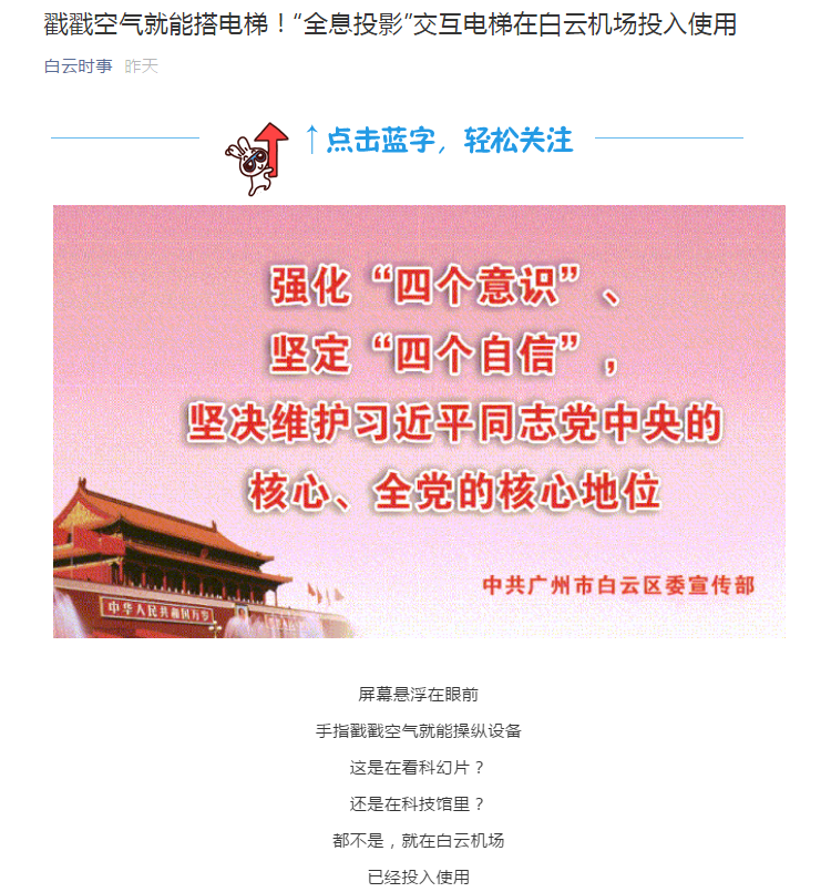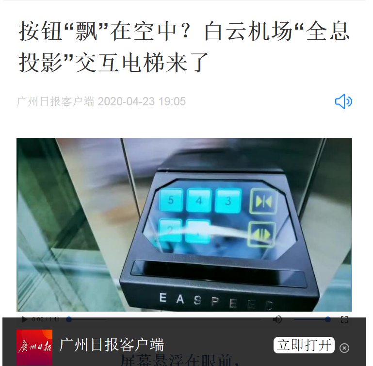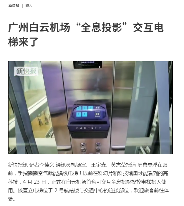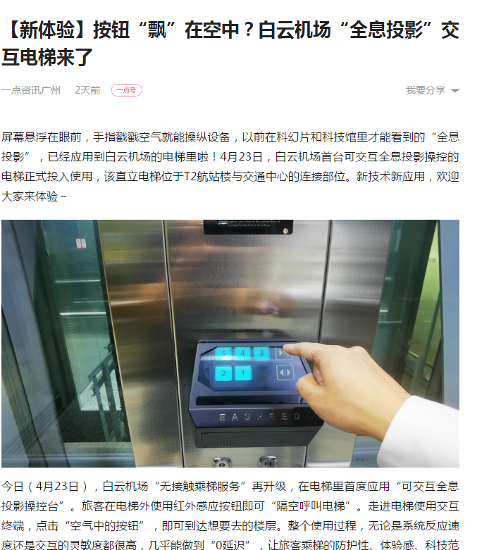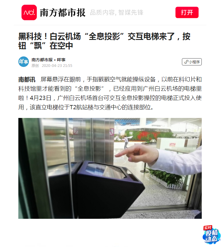机场作为口岸单位,疫情防控工作备受社会公众关注。近日,在白云机场二号航站楼投入使用的防疫黑科技——“全息投影”交互电梯,引起了国内各大媒体的广泛赞誉及关注。